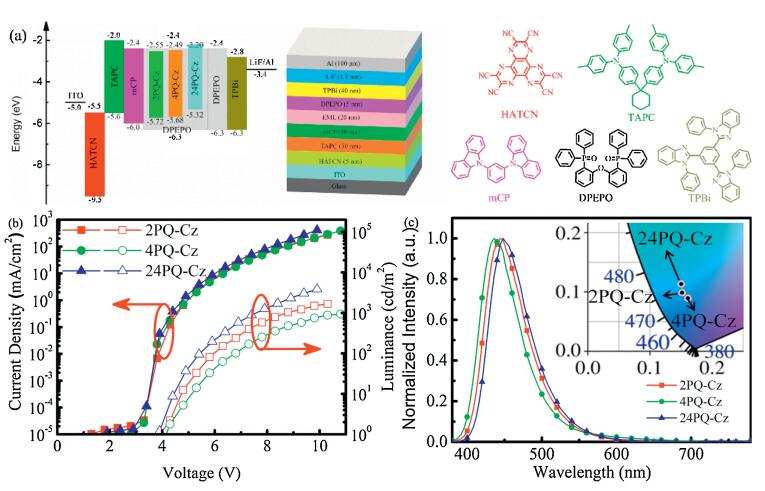 Figure 3 (a) The energy level diagrams, OLED structure, and the chemical structure of the materials used in the TADF devices. Performance of 2PQ-Cz-, 4PQ-Cz- and 24PQ-Cz-based OLED with doped concentration of 40% in DPEPO. (b) Current density and luminance versus voltage (J-V-L) characteristics. (c) EL spectra of the TADF OLEDs at 7 V.