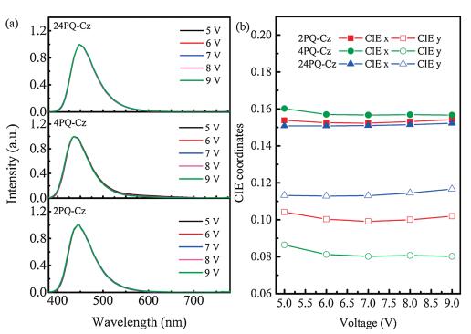 In conclusion, we have developed three new deep blue emitters, namely, 2PQ-Cz, 4PQ-Cz and 24PQ-Cz, by connecting quinzonline acceptor with carbazole donor. Their bandgaps of 3.17, 3.19, 3.12 eV are found to be sufficiently large to achieve deep blue light, responding the singlet state energy levels of 3.12, 3.19 and 3.12 eV, respectively. These emitters-based OLEDs exhibit deep blue emission with the maximum wavelength ≤ 450 nm and narrow FWHM ≈ 60 nm. Especially, a CIE of y = 0.080 is achieved for 4PQ-Cz-based OLED. This result indicates that the asymmetric quinazo-line as acceptor not only can achieve deep blue materials for OLED, but also can effectively modulate the luminescence properties. Moreover, EL spectra and CIE of these three emitters based OLEDs are almost completely consistent ranging from 5 V to 9 V, which indicate that the deep blue EL emissions are fairly stable under the applied voltage range. The corresponding ΔCIE (x, y) of (0.000, 0.002), (0.003, 0.005) and (0.001, 0.003) can be negligible for 2PQ-Cz-, 4PQ-Cz- and 24PQ-Cz-based OLEDs, respectively.