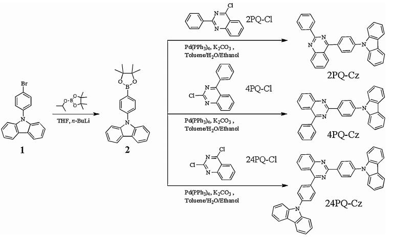 The synthetic routes for 2PQ-Cz, 4PQ-Cz, and 24PQ-Cz are showed in Scheme 1, the details are showed in the Supporting information. The N-phenyl-carbazole boronic ester was prepared according to our previous work [23]. The emitters 2PQ-Cz, 4PQ-Cz, and 24PQ-Cz were then synthesized through Pd-catalyzed Suzuki-Miyaura coupling reaction of 2 with 4-chloro-2-phenylquinazoline (2PQ-Cl), 2-chloro-4-phenylquinazoline (4PQ-Cl) and 2, 4-dichlor-oquinazoline (24PQ-Cl), respectively. They were purified using column chromatography on silica gel, and further purified by temperatures-gradient sublimation under vacuum. The structure of the final product was confirmed by 1H NMR, 13C NMR, and mass spectrometry (Figs. S1-S9 in Supporting information). In addition, the thermal properties were characterized by thermogravimetric analysis (TGA) and differential scanning calorimetry (DSC) in nitrogen atmosphere. As shown in Fig. S10 (Supporting informa-tion), 2PQ-Cz, 4PQ-Cz, and 24PQ-Cz display excellent thermal stability with the decomposition temperature of 371, 375 and 468℃, respectively, which are good enough for application in electroluminescent device.