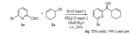 • An efficient water-based bismuth-mediated addition reaction of carbonyl compound with cyclic allylic halide was developed. The reactions proceeded smoothly in aqueous DMF in the presence of ammonium iodide to afford the corresponding syn-homoallylic alcohols in moderate to good yields with excellent diastereoselectivities (>99:1 syn:anti). Reversal of product diastereoselectivity was observed when heteroaryl aldehyde possessing an adjacent chelating nitrogen atom was employed as substrate.
