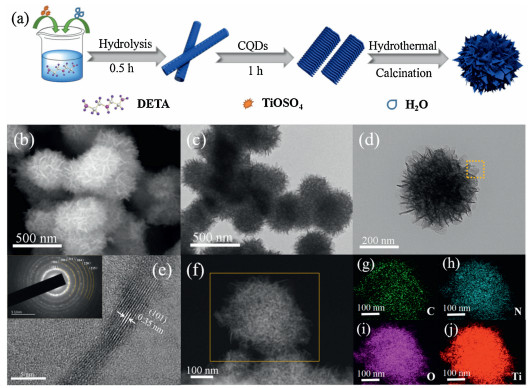 Figure 1. (a) Schematic illustration for the growth process of mesoporous CT-500 product, (b) SEM image, (c, d) TEM images, (e) HRTEM image (inset is the SAED pattern), (f) STEM image, and (g–j) corresponding elemental mapping of CT-500.HRTEM image was further used to determine the internal structure of CT-500 (Fig. 1e). The distinct interplanar spacing is about 0.35 nm, which is indexed to the (101) crystal plane of anatase phase, indicating the formation of TiO2. STEM image and the elemental mapping (Figs. 1f-j) illustrate that CT-500 is composed of Ti, O, C and N elements, showing a homogeneous distribution across the sample. It should be noted that C and N elements mainly derive from isopropanol, ethylene glycol and DETA, respectively. Their existence will make for the enhancement of the conductivity and increase of surface defects.