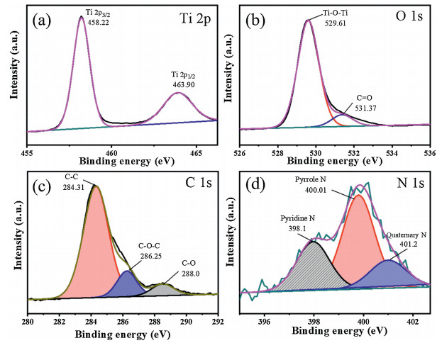 Fig. 3 provides the high-resolution XPS spectra of Ti, O, C and N elements. Observed from Fig. 3a, there are two peaks at the binding energies of about 463.90 eV and 458.22 eV, which are assigned toTi 2p1/2 and Ti 2p3/2, respectively [20, 21]. The O 1s high-resolution spectrum (Fig. 3b) shows two peaks at 529.61, 531.37 eV, corresponding to Ti-O-Ti and C¼O bonds, respectively [22]. Three peaks in the C 1s fitted XPS spectrum (Fig. 3c) are ascribed to C—C (284.31 eV), C—O—C (286.25 eV), C¼O (288.0 eV), respectively [23]. Fig. 3d displays three identified peaks at 398.1, 400.01, 401.2 eV of N 1s high-resolution spectrum, origining from pyridine N, pyrrole N and quaternary N, respectively [11]. The full XPS spectrum of CT-500 (Fig. S5 in Supporting information) exhibits the characteristic signals of Ti 2p, O 1s, C 1s and N 1s [24, 25], in agreement with the EDX analysis (Fig. S6 in Supporting information). The above results further affirm that the existence of C and N into the framework of TiO2, which is in favor of the improvement of conductivity and more active sites for sodium storage.