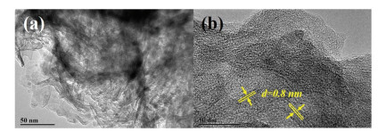 The morphology of Nb-TNFs was characterized by TEM images. As displayed in Fig. 1a, Nb-TNFs exhibit a morphology of two-dimensional nanoflakes. In addition, small amount of one-dimensional nanotubes are also observed at the edge of the nanoflakes. The unique morphology of Nb-TNFs can be attributed to the synthetic method. Previous studies found that pure TNTs fabricated via the same procedure without Nb have a regular tube morphology, which originated from the curving of tianate nano-sheet [15]. Whereas, the addition of small fraction of Nb2O5 affects the curve of titanate nanosheet, leading the formation of the mixture of nanoflake and nanotubes. The high resolution TEM images in Fig. 1b show that there are some nanotube structure in the nanoflakes, and an interlayer spacing of 0.8 nm is observed, which corresponds to the (002) facet of sodium titanate [14, 15]. The unchanged crystal layer spacing indicates that the addition of Nb does not change the origin [TiO6] structure in TNTs. In addition, no lattice for [NbO6] is observed, indicating Nb may exist as doping atoms in Nb-TNFs.