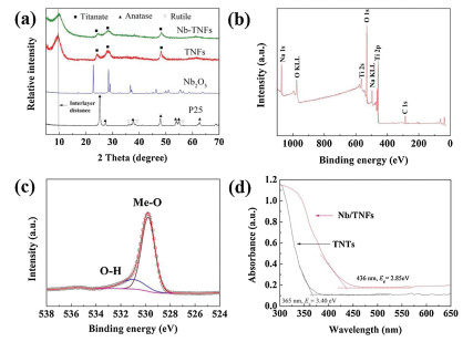 The optical adsorption property of Nb-TNFs and neat TNTs are characterized by UV-DRS spectra. As shown in Fig. 2d, the light adsorption of TNFs mainly distributes in the UV region. The light adsorption edge for TNTs is estimated to be 365 nm, which corresponds to a band gap of 3.40 eV. In contrast, Nb doping significantly enhanced the light adsorption of TNFs especially in visible light region. The light adsorption edge exhibits an obvious red shift to 436 nm, and the band gap was accordingly narrowed to 2.85 eV. The incorporation of Nb introduced new orbitals into original TNTs, which may act as midgap states and subsequently enhanced the visible light utilization [16].