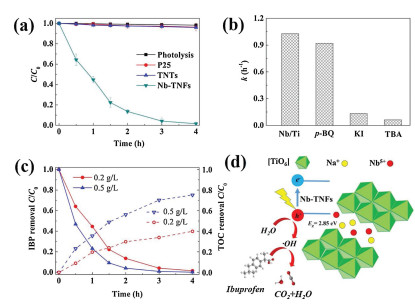 Based on the aforementioned statements, the mechanisms involved in the enhanced photocatalytic degradation of IBP are summarized and schematically illustrated in Fig. 3d. In presence of Nb5+ between [TiO6] layers narrows the band gap of Nb-TNFs, which significantly enhanced the visible light utilization. Water molecules on the surface of Nb-TNFs are then oxidized by h+ and transformed into ·OH. As the dominated reactive species, h+ and ·OH degrade IBP into H2O and CO2.