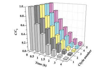 In addition to the photocatalytic activity, reusability is also very important for a photocatalyst. After the photocatalytic experiment, Nb-TNFs can be easily collected by filtration through a 0.22 mm nylon membrane. The collected solids were washed and dried overnight to undergo the subsequent recycle tests. The reaction conditions for the recycle tests are the same with the first trial. Results show that Nb-TNFs exhibit excellent photocatalytic activity in the consecutive recycle experiments. Over 93% of IBP is still removed in the fifth reuse cycle (Fig. 4). The observation indicates good photo-stability as well as reusability for Nb-TNFs.