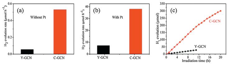 Figure 1. (a) Hydrogen evolution rate to Y-GCN and C-GCN without Pt in 80 mL of aqueous solution under visible-light irradiation. (b) Pt-loaded Y-GCN and C-GCN photocatalysts in aqueous solution under visible-light irradiation. (c) Time course of hydrogen evolution over 20 h for C-GCNand Y-GCN.To explore the marked difference of the photocatalytic performance between C-GCN and Y-GCN, some tests were used. As shown in Fig. 2a, the C-GCN powder is gray, while Y-GCN is faint yellow. Compared with Y-GCN, C-GCN has much stronger absorption intensity in the visible light region and the absorption edge obviously red-shifts. As shown in Fig. 2b, the calculated bandgaps of Y-GCN and C-GCN are 2.78 eV and 2.66 eV, respec-tively. As shown in Fig. 2c, C-GCN exhibits much better photocurrent than Y-GCN. C-GCN shows lower intensity of PL spectra than Y-GCN (Fig. 2d). The above results indicate that C-GCN has much better light absorption and more efficient separation rate of photo generated electrons and holes than Y-GCN.