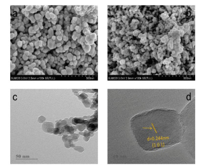 Figure 1. (a) XRD spectra of pure ZnO and La-ZnO samples; (b) Local enlarged XRD spectra of samples with different La-doped contents ranging from 30° to 40°; (c) XPS spectrum (O 1s) of La-ZnO; (d) EPR spectra of ZnO and La-ZnO.The SEM and TEM diagrams of ZnO and La-ZnO are shown in Fig. 2. After comparison (Figs. 2a and b), it was found that the morphology of La-ZnO did not change obviously and grain diameter size was around 15-20 nm in both pure and doped ZnO particles. Fig. 2d shows the HRTEM image of the La-ZnO sample, the lattice fringes with a width of 0.244 nm correspond to the (1 0 1) crystal plane of ZnO nanosheets, which is close to the theoretical value of 0.244 nm.
