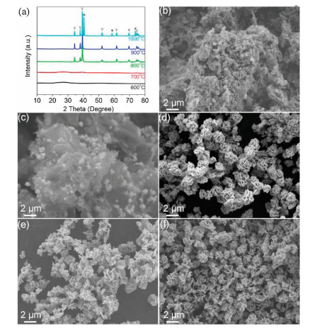 Figure 1. (a) XRD patterns of the produced samples at the different temperatures, ▽-Mo2C phase, *-metal Mo phase. FESEM images of the produced samples at the different temperatures: (b) 600, (c) 700, (d) 800, (e) 900 and (f) 1000 ℃.FESEM and XRD were used to characterize the structure and morphology of the samples synthesized with different sodium citrate/(NH4)6Mo7O24·4H2O ratios at 800 ℃, as presented in Fig. 2. It can be clearly seen that the less addition of (NH4)6Mo7O24·4H2O (5:1) results in Mo2C-carbon composite (Fig. 2a), while the surplus (NH4)6Mo7O24·4H2O with sodium citrate/(NH4)6Mo7O24·4H2O ratios lower than 1:3 leads to the formation of sheet-like MoO3 (Figs. 2a, e and f). Mo2C phase can be obtained as the sodium citrate/(NH4)6Mo7O24·4H2O ratios are in the range of 1:2 to 2:1 (Fig. 2a). According to the above results, high-quality MCMFs can be achieved at 800 ℃ with a sodium citrate/(NH4)6Mo7O24·4H2O ratio of 1:1. The optimized MCMFs shows the flower-like morphology with micro-size, which is constructed by interconnected NSs with a thickness of 50 nm on average, as shown in higher magnification FESEM image (Fig. 3a). The hierarchical microflower structure assembled by NSs subunits is further confirmed by TEM observation in Figs. 3b and c. A typical HRTEM image (Fig. 3d) illustrates the lattice fringes with a spacing of 0.23 nm, in good agreement with spacing of (101) of Mo2C. Typical SAED pattern (the inset in Fig. 3d) shows a well-defined lattice, further indicating their single-crystalline characteristics of the NSs.