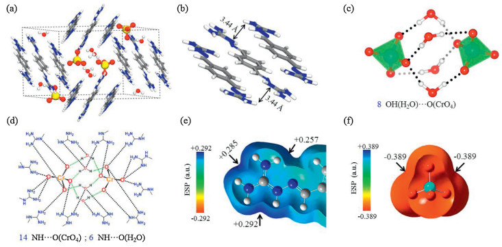 Figure 1 (a) The crystal lattice of BBIG-CrO4 determined by single-crystal X-ray diffraction, the hydrogen positions were optimized by density functional theory (DFT) calculations. (b) The stacking patterns of BBIG cations. (c) The structure of the (CrO42-)2(H2O)4 cluster. (d) Schematic diagram of the hydrogen bonds network between one (CrO42-)2(H2O)4 cluster and its surrounding twelve guanidine groups. Electrostatic potential mapping on the electron density van der Waals surfaces (isodensity = 0.001 a.u.) of BBIG (e) and CrO42- (f).