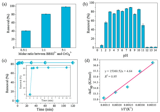 Figure 2 (a) Removal percentage of CrO42- using the BBIG-Cl ligand with different equivalent ratios of cationic ligands and CrO42-. (b) Effect of pH on the removal of CrO42- by the BBIG-Cl ligand. (c) Removal kinetics of CrO42- by the BBIG-Cl ligand as a function of contact time. (d) Van't Hoff plot for dissolution of BBIG-CrO4 in the range of 25-45 ℃.