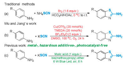 2-Aminobenzothiazoles represent an important class of N-heterocycles [7] whose valuable pharmacological and biological activities make them privileged scaffolds in research and drug developments [8]. A tremendous amount of effort has been paid towards developing novel methods for their preparation [9]. Among the established synthetic approaches, the cascade oxidative coupling/cyclization of aromatic amines with thiocyanate salts is an ideal choice for the construction of such compounds given the cheapness and readily availability of raw materials. However, the traditional method generally requires the usage of excessive toxic molecular bromine (or other halogenated oxidant) and corrosive solvent (such as hydrochloric acid, acetic acid), which not only leads to high manufacturing cost but also causes series environmental problems (Scheme 1a). Recently, Wu and Jiang pioneered the copper-catalyzed oxidative thiocyanation of anilines and KSCN with molecular oxygen as an oxidant and BF3·Et2O as the promoter in dimethyl sulfoxide (DMSO) at 100 ℃ (Scheme 1b) [10]. From a practical and safety point of view, the risk of employing pure O2 and explosive DMSO at high temperature, and the usage of hazardous synthetic acid and metal catalysts largely restrict its application for large-scale industrial manufactures.