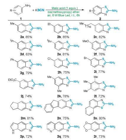Our preliminary exploration started with 4-toluidine (1a) as a template substrate. Treatment of 1a, NaSCN (2 equiv.), and HOAc (2 equiv.) in bis(methoxypropy)ether (BME, 1 mL) under ambient air by the irradiation of a 6 W blue LED lamp led to the production of the expected 6-methylbenzo[d]thiazol-2-amine (2a) in 25% NMR yield (Table 1, entry 1). Next, the screening of thiocyanate salts (entries 1–3) revealed that the KSCN was the optimal thiocyanation source (entry 2). A series of natural acids (entries 4–8), include glycolic acid, lactic acid, malic acid, oxalic acid and citric acid were subjected to investigation, and malic acid (entry 6) was found to be the best choice for this present reaction. An optimization of the solvents (entries 9–14) illustrated that none of the other solvents was superior to BME. Finally, the impact of varying the concentration of 1a, the amount of KSCN and malic acid were investigated. Decreasing the concentration of 1a resulted in no improvement in the reaction efficiency (entry 15), whereas a slightly lower yield of 2a was observed when the concentration of 1a was increased to 0.4 mmol/mL (entry 16). Altering the amount of KSCN did not improve the yield of 2a (entries 17 and 18). Increasing the loading of malic acid to 3 equiv. did not provide any significant changes in reaction outcome (entry 19). Reducing the amount of malic acid to 1 equiv. was feasible; however, further decreasing to 0.8 equiv. resulted in a lower yield (entries 20 and 21). No conversion of 4-toluidine was observed in the absence of a Brønsted acid (entry 22). No improvement in the photocatalytic reaction was detected when pure oxygen gas was used instead of ambient air (entry 23). When the reaction was conducted under nitrogen atmosphere, no reaction occurred (entry 24). Only a trace amount of 2a was formed while using 6 W green LED lamp as the light source (entry 25). Conducting the reaction under the radiation of sunlight led to much lower reaction efficiency (entry 26). The present transformation did not proceed under the dark condition, indicating that this present reaction involves a visiblelight-induced mechanism (entry 27).
