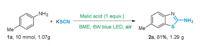 The synthetic applicability of the present reaction was further explored (Scheme 3). In the small-scale reaction, a concentration of 0.2 mol/L of the substrate 1 was required, and the increasing of substrate 1 in concentration would decrease the reaction efficiency. Much to our delight, decreasing the amount of BME had virtually no effect on the yield. The cascade reaction of 4- toluidine (10 mmol) with a 5-fold increase in the concentration of 1a provided the expected product 2a in 81% yield (1.29 g). In addition, the pure 2-aminobenzothiazole 2a could be readily collected through extraction.