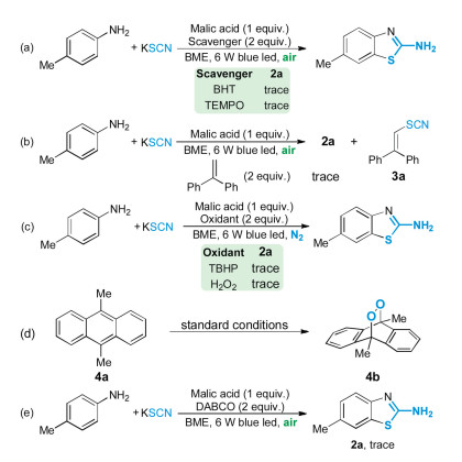 In summary, we have developed a simple and practical method for the synthesis of 2-aminobenzothiazoles through visible-lightinitiated malic acid-promoted cascade coupling/cyclization of aromatic amines and KSCN with air ambient as an oxidant at room temperature. Mechanistic investigation revealed that the singlet oxygen was produced from molecular oxygen (in air) under the visible-light irradiation, which is pivotal for this cascade reaction to proceed. The protocol is operationally easy and practical with a simple extraction necessary to obtain the target products in good yields and purity for large-scale preparations, thus circumventing the tedious chromatographic purification procedures. Given the readily available materials, the clean conditions (metal-, halogen-, corrosive acid- and photocatalyst-free), high scalability and operational simplicity, this protocol is highly attractive in the field of fine chemistry and pharmaceutical industry.