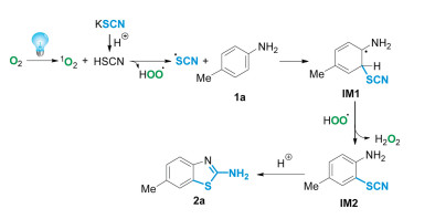A plausible reaction mechanism for the light-initiated cascade reaction based on the above experimental results and related literature was illustrated in Scheme 5 [12]. Initially, the singlet oxygen 1O2 originated from molecular oxygen in air under the irradiation of visible-light. Meanwhile, the thiocyanic acid was generated in situ by the reaction of thiocyanate salts with malic acid. Subsequently, the active singlet oxygen abstracted one electron from thiocyanic acid to produce a thiocyanate radical and a hydroperoxyl radical. The thiocyanate radical easily reacted with 1a to generate a free-radical intermediate IM1, which underwent dehydro-aromatization to form the 2-thiocyanatoaniline IM2 along with the generation of hydrogen peroxide (detected by a KI-starch test paper) in the presence of hydroperoxyl radicals. Finally, the nucleophilic amino group of IM2 intramolecular attacked the carbon atom of SCN group to generate the target 2-aminobenzothiazole 3.