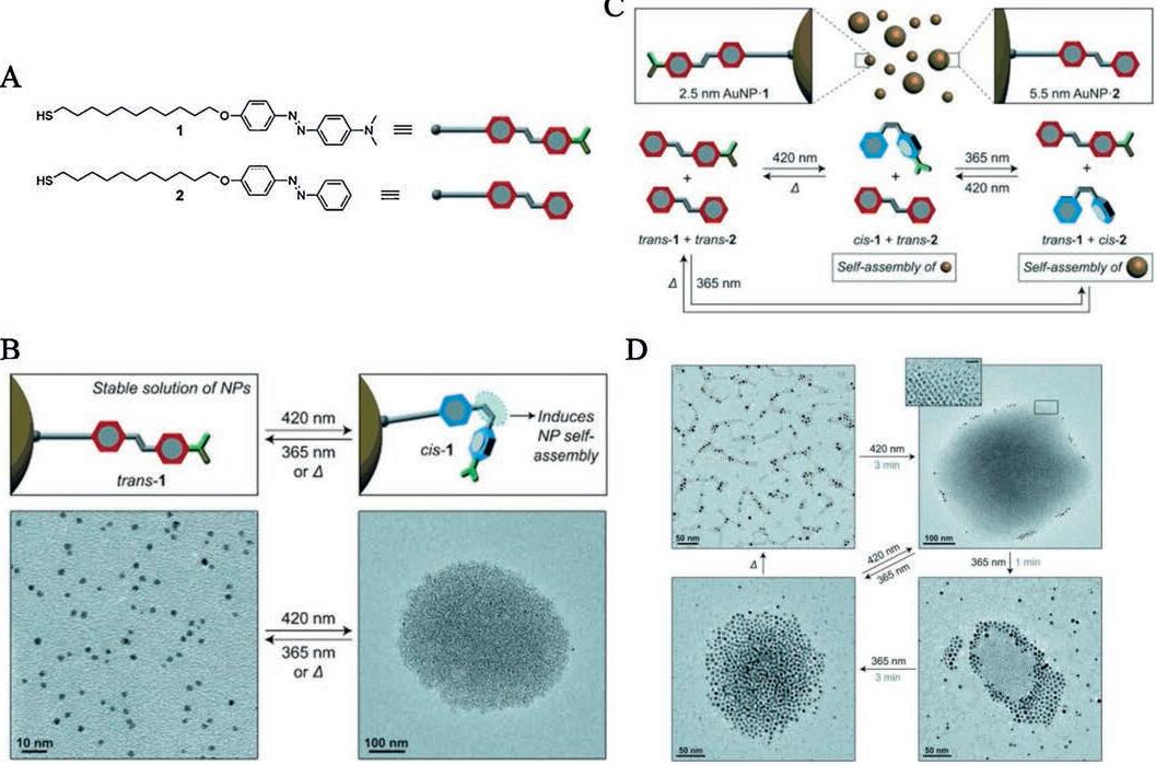 Figure 4 (A) Structural formulas of the thiolated azobenzenes used in this study. (B) Reversible isomerization of 1 on the surface of a nanoparticle (upper) and TEM images of 1-functionalized Au NPs before (left) and after (right) exposure to blue (420 nm) light. Aggregates such as the one on the right could be disassembled using UV (365 nm) light or by gentle heating (down). (C) Components of the system:1-functionalized 2.5 nm Au NPs and 2-functionalized 5.5 nm Au NPs (upper) and mechanism of self-assembly and disassembly after irradiation or heat (down). (D) TEM images of NPs after changes in the UV-vis spectra. Reproduced with permission [55]. Copyright 2015, WILEY-VCH Verlag GmbH & Co. KGaA, Weinheim.