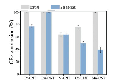 Figure 1. CBz conversion efficiency at 250 ℃ with the two periods of ageing time. Reaction condition: 500 ppm CB, 10 vol% O2, N2 balance and WHSV 20, 000 mL g-1 h-1.Figure 2