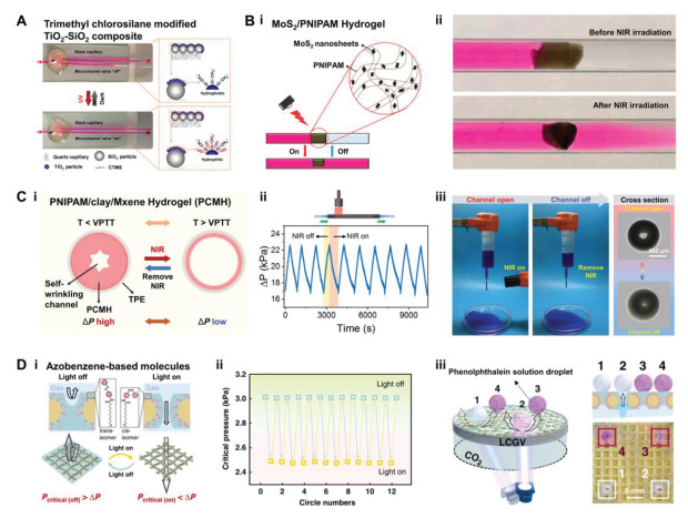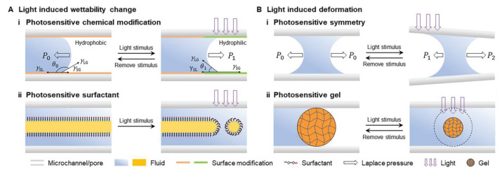 Photochemical effect driven fluid behavior control in microscale pores and channels