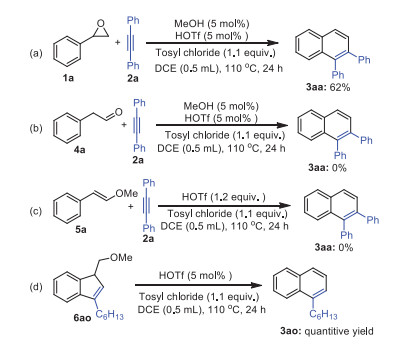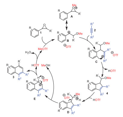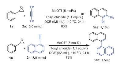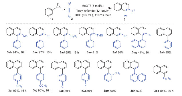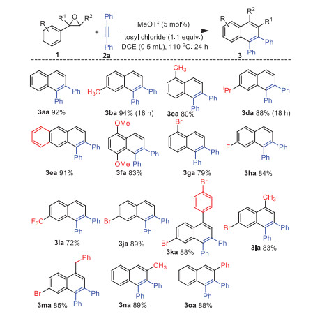 Citation: Song Zou, Zeyu Zhang, Chao Chen, Chanjuan Xi. MeOTf-catalyzed formal [4 + 2] annulations of styrene oxides with alkynes leading to polysubstituted naphthalenes through sequential electrophilic cyclization/ring expansion[J]. Chinese Chemical Letters, ;2022, 33(6): 3021-3025. doi: 10.1016/j.cclet.2021.12.012 shu