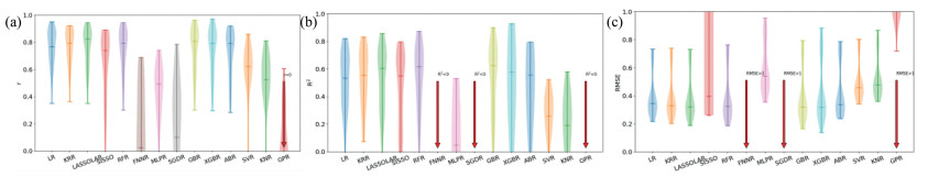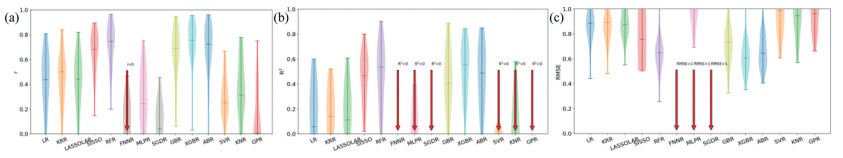 Figure 2.  In terms of ΔG(NO3), the evaluation results of each algorithm on the testing set: (a) Result of r, (b) result of R2, (c) result of RMSE.