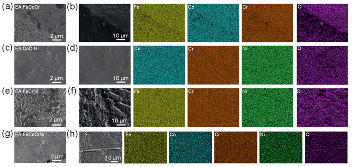 Figure 2.  SEM and corresponding SEM‒EDS mapping images of the electrochemically activated MEAs. (a, b) EA-FeCoCr. (c, d) EA-CoCrNi. (e, f) EA-FeCrNi. (g, h) EA-FeCoCrNi.