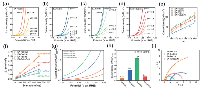 Figure 4.  Electrocatalytic properties of the electrodes for the OER. (a-d) pH-dependent LSV polarization curves of various catalysts. (a) EA-FeCoCr, (b) EA-CoCrNi, (c) EA-FeCrNi and (d) EA-FeCoCrNi. (e) Specific OER activity at 1.55 V vs. RHE after iR correction as a function of pH. (f) Capacitive current density differences (Δj = (jajc)/2 at 0.82 V versus RHE as a function of scan rate. The linear slope is equivalent to that of Cdl. (g) The corresponding LSV polarization curves normalized to the specific activities of various catalysts by ECSAs. (h) Current density values at an overpotential of 300 mV. (i) Nyquist plots of various catalysts at 1.52 V versus RHE in 1 mol/L KOH solution.