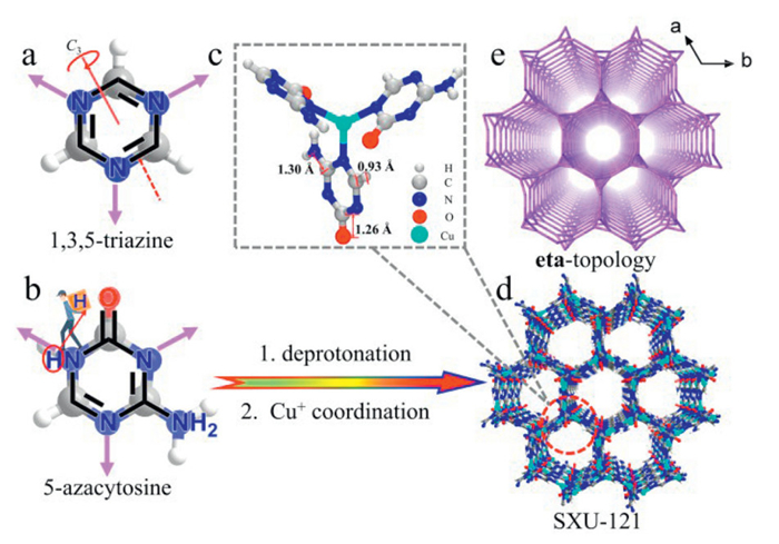 Figure 1.  Structural illustration of SXU-121. (a) The structure of 1,3,5-triazine. (b) The structure of selected 5-azacytosine ligand. (c) The coordination environment of Cu as 3-connected node. (d) The one-dimensional channels along the crystallographic c direction. (e) The 3-connected eta-topology of SXU-121. Cu atom, cyan; C atom, gray; O atom, red; N atom, blue; H atom, white.