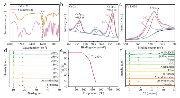 Figure 2  (a) FT-IR spectra of 5-azacytosine and SXU-121. (b) Cu 2p1/2 and 2p3/2 XPS spectra of SXU-121. (c) Cu LMM Auger electron spectroscopy of SXU-121. (d) The VTPXRD patterns of SXU-121. (e) The TG curve of SXU-121. (f) The PXRD patterns of SXU-121 after immersed in boiling water, basic environment in KOH solution (0.1 mol/L) and various organic solvents for 24 h.