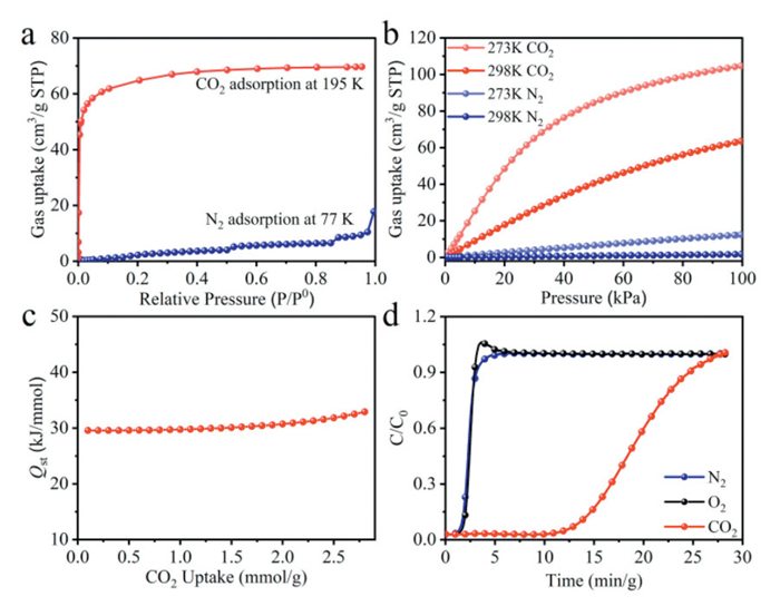 Figure 3.  (a) Adsorption isotherms of N2 at 77 K and CO2 at 195 K for SXU-121. (b) Adsorption isotherms for CO2 and N2 at 273 K and 298 K for SXU-121. (c) The isosteric heat of CO2 adsorption (Qst) for SXU-121 calculated according to the Clausius-Clapeyron equation. (d) Experimental column breakthrough curves for CO2/O2/N2 mixture (1/21/78, v/v/v) in an adsorber bed packed with SXU-121 at 298 K and 1 bar.