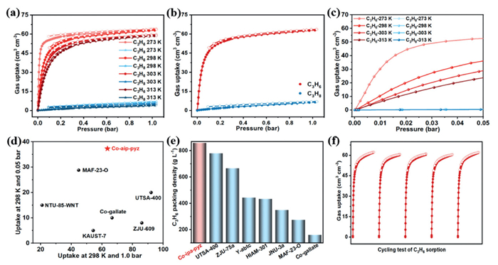 Figure 2  (a) The sorption isotherms of Co-aip-pyz at 273, 298, 303, and 313 K, respectively. (b) The C3H6 and C3H8 sorption isotherms of Co-aip-pyz at 298 K. (c) C3H6 uptake of Co-aip-pyz at 0.05 bar. (d) Comparison of C3H6 uptake at 0.05 bar and 1.0 bar for Co-aip-pyz and other top-performing MOFs. (e) Comparison of C3H6 packing density for Co-aip-pyz and other best-performing MOF materials at 313 K and 1.0 bar. (f) Cycling test of C3H6 sorption measurements on Co-aip-pyz at 298 K from 0 to 1.0 bar.