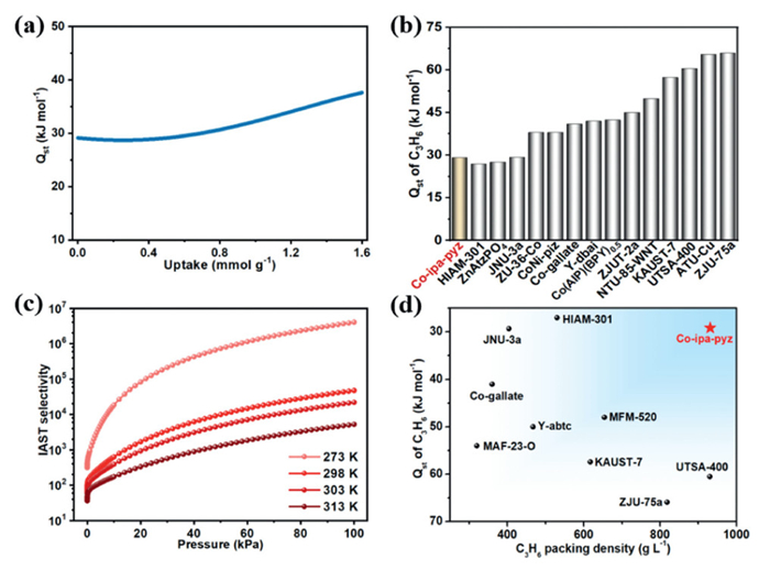 Figure 3  (a) Isosteric heat of adsorption of C3H6 for Co-aip-pyz. (b) Comparison of the zero-coverage heat of adsorption with those of other MOF materials for C3H6/C3H8 separation. (c) IAST selectivity of Co-aip-pyz for equimolar C3H6/C3H8 mixture at different temperatures. (d) Comparison of C3H6 packing density and isosteric heat of adsorption under ambient conditions for Co-aip-pyz and other best-performing MOF materials.
