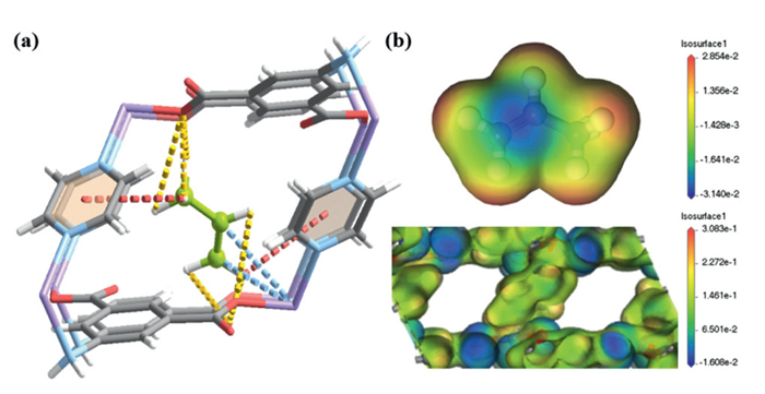 Figure 4.  (a) Illustration of C3H6 preferential adsorption sites in Co-aip-pyz by theoretical calculation. (b) The electrostatic potential of C3H6 molecule (top), and Co-aip-pyz pore surfaces (bottom).