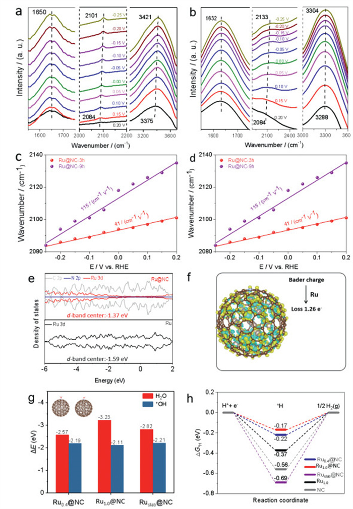 Figure 4.  In-situ ATR-SEIRAS spectra recorded from 0.2 V to ~0.25 V for (a) Ru@NC-3h and (b) Ru@NC-9h The Stark tuning rate, determined from changes in the (c) RuH band wavenumber and (d) O-H stretching wavenumber of interfacial water. DFT data on the structural models (Fig. S7). (e) Partial density of states based on Ru1.0@NC and Ru1.0. (f) Charge density difference on Ru1.0@NC (the cyan and yellow regions represent the charge depletion and accumulation space, where the gray and blue spheres stand for Ru and N atoms, respectively). Inset: Bader charge. (g) Calculated H2O and *OH adsorption energy. (h) *H adsorption energy.