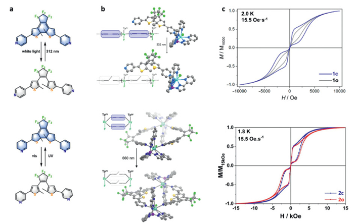 Figure 1 (a) Open and closed forms of the photoactive bispyridyl dithienylethene units used as a bridging ligand in 1c and 2c. (b) Single-crystal structures of 1c and 1o (top), 2c and 2o (bottom). (c) Variable field magnetization data for 1c and 1o (top) and for 2c and 2o (bottom). Reproduced with permission [48]. Copyright 2020, American Chemical Society. Reproduced with permission [54]. Copyright 2023, the Royal Society of Chemistry.