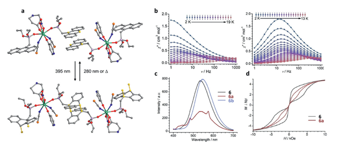 Figure 3 (a) Single-crystal structures of 6 and 6a. (b) The frequency dependence of the out-of-phase χ′′ of the ac susceptibilities for 6 (left) and 6a (right). (c) Photoluminescence spectra of 6, 6a and 6 heated. (d) Variable field magnetization data for 6 and 6a. Reproduced with permission [59]. Copyright 2023, Wiley-VCH GmbH.