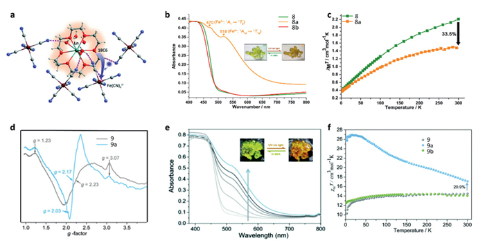 Figure 4 (a) Single-crystal structures of [Ln3+(18C6)(H2O)3]Fe3+(CN)6·2H2O (Ln = Eu(8) and Dy(9)). (b) UV–vis spectra for 8, 8a and 8b. Inset: photochromism of 8 at room temperature. (c) χMT versus temperature (T) for 8 and 8a. (d) EPR spectra of 9 and 9a. (e) UV–vis spectra for 9, 9a. Inset: photochromism of 9 at room temperature. (f) χMT versus temperature (T) for 9, 9a and 9b. Reproduced with permission [68]. Copyright 2015, American Chemical Society. Reproduced with permission [72]. Copyright 2021, Royal Society of Chemistry.