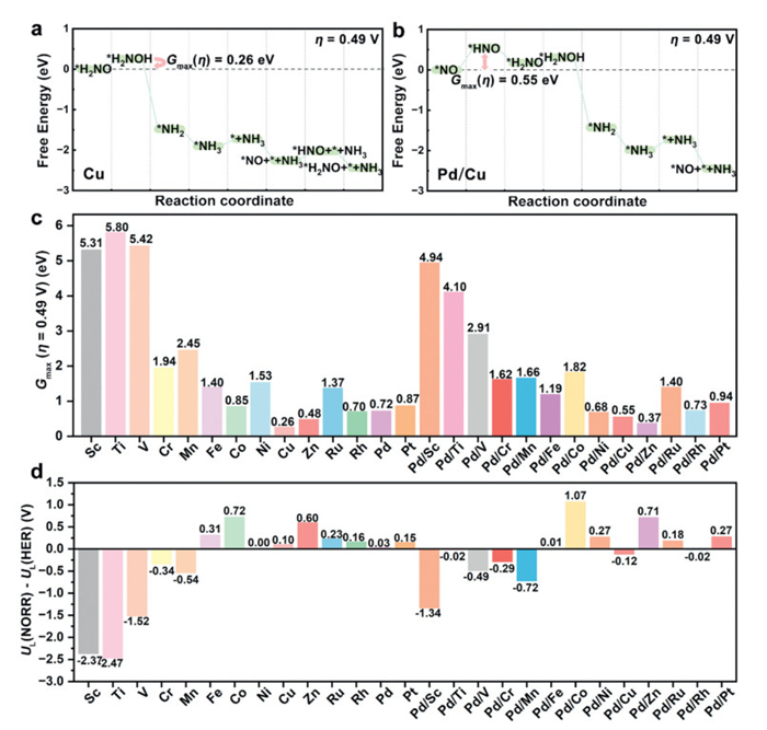 Figure 4.  The catalytic activity and selectivity of catalysts. Free energy diagrams of NORR over (a) Cu and (b) Pd/Cu at η = 0.49 V vs. RHE after renumbering the steps so that the reaction intermediate with the lowest free energy locates at the beginning of the reaction coordinate. (c) The Gmax(η = 0.49 V) values of all catalysts. (d) The differences between UL(NORR) and UL(HER) of all catalysts.