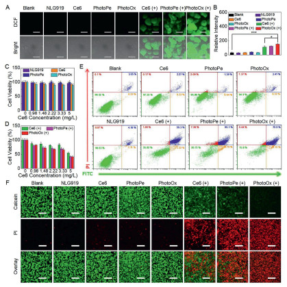 Figure 2.  ROS production and PDT effect of PhotoOx. (A) Intracellular ROS production ability and (B) the corresponding fluorescence intensity analysis of Ce6, PhotoPe and PhotoOx by using DCFH-DA as ROS probe (n = 3). Scale bar: 30 µm. Cell viability of 4T1 cells after treatment with NLG919, Ce6, PhotoPe or PhotoOx (C) in the absence or (D) in the presence of light (n = 4). (E) Flow cytometry analysis and (F) calcein AM/PI staining of 4T1 cells after treatment with NLG919, Ce6, PhotoPe or PhotoOx with or without light irradiation. Scale bar: 200 µm. Data are presented as mean ± SD. *P < 0.05, ***P < 0.001 were tested via a Student's t-test.