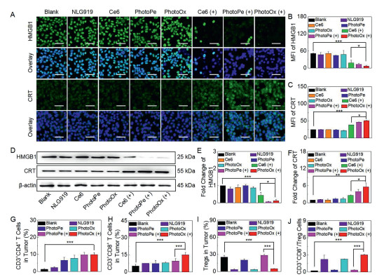 Figure 3.  PDT-induced ICD response and immune activation of PhotoOx. (A) Immunofluorescence analysis, and the corresponding quantitative analysis of (B) HMGB1 and (C) CRT of 4T1 cells after incubation with NLG919, Ce6, PhotoPe or PhotoOx and subsequently treatment with or without light irradiation. Scale bar: 50 µm. (D) Western blot analysis, and the corresponding fold changes of (E) HMGB1 and (F) CRT in 4T1 cells after different drug treatments and light exposure. Quantitative analysis of the percentage of (G) CD3+CD4+ T cells, (H) CD3+CD8+ T cells, (I) T regulatory cells and (D) the ratio of CD3+CD8+ T cells and T regulatory cells in tumors after different drug treatments and light exposure (n = 3). Data are presented as mean ± SD (n = 3). *P < 0.05, **P < 0.01, ***P < 0.001 were tested via a Student's t-test.