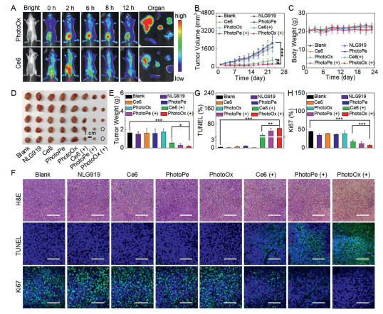 Figure 4.  Primary tumor inhibition of PhotoOx. (A) Real time fluorescence analysis and the biodistribution of PhotoOx and Ce6 after intravenous injection. (B) Tumor volume and (C) body weight variations of the mice in 23 days after treatment with NLG919, Ce6, PhotoPe or PhotoOx with or without laser irradiation (n = 5). (D) Sacrificed tumor tissues and (E) the corresponding tumor weight of the mice after those treatments on the 23rd day (n = 5). (F) H&E, TUNEL and Ki67 staining of tumor tissues after those treatments on the 23rd day. Quantification of (G) TUNEL and (H) Ki67 positive cells in tumor tissues after those treatments on the 23rd day (n = 3). Scale bar: 100 µm. Data are presented as mean ± SD. *P < 0.05, **P < 0.01, ***P < 0.001 were tested via a Student's t-test.