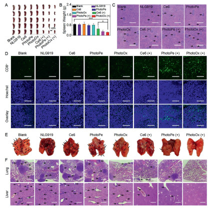 Figure 5.  Metastatic tumor inhibition of PhotoOx. (A) Sacrificed spleen and (B) the corresponding spleen weight of the mice after treatment with NLG919, Ce6, PhotoPe or PhotoOx with or without laser irradiation on the 23rd day. Data are presented as mean ± SD (n = 5). (C) H&E staining of spleen tissues after those treatments on the 23rd day. Scale bar: 100 µm. *P < 0.05, ***P < 0.001 were tested via a Student's t-test. (D) Immunofluorescence of CD8+ T cells in tumor tissues after those treatments. Scale bar: 100 µm. (E) Metastatic tumors in lung after those treatments. (F) H&E staining of lung, liver and spleen after those treatments. Scale bar: 500 µm.