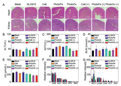 Figure 6.  Biosafety of PhotoOx. (A) H&E staining of heart and kidney after treatment with NLG919, Ce6, PhotoPe or PhotoOx with or without laser irradiation. Scale bar: 500 µm. Blood biochemical analysis of (B) ALT, (C) AST, (D) BUN and (E) UA of mice after those treatments. Blood routine analysis of (F) HGB, MCV, RDW, MPV, RBC and (G) MCH, Lymph, Gran, HCT, Mon of mice after those treatments. Data are presented as mean ± SD (n = 3).