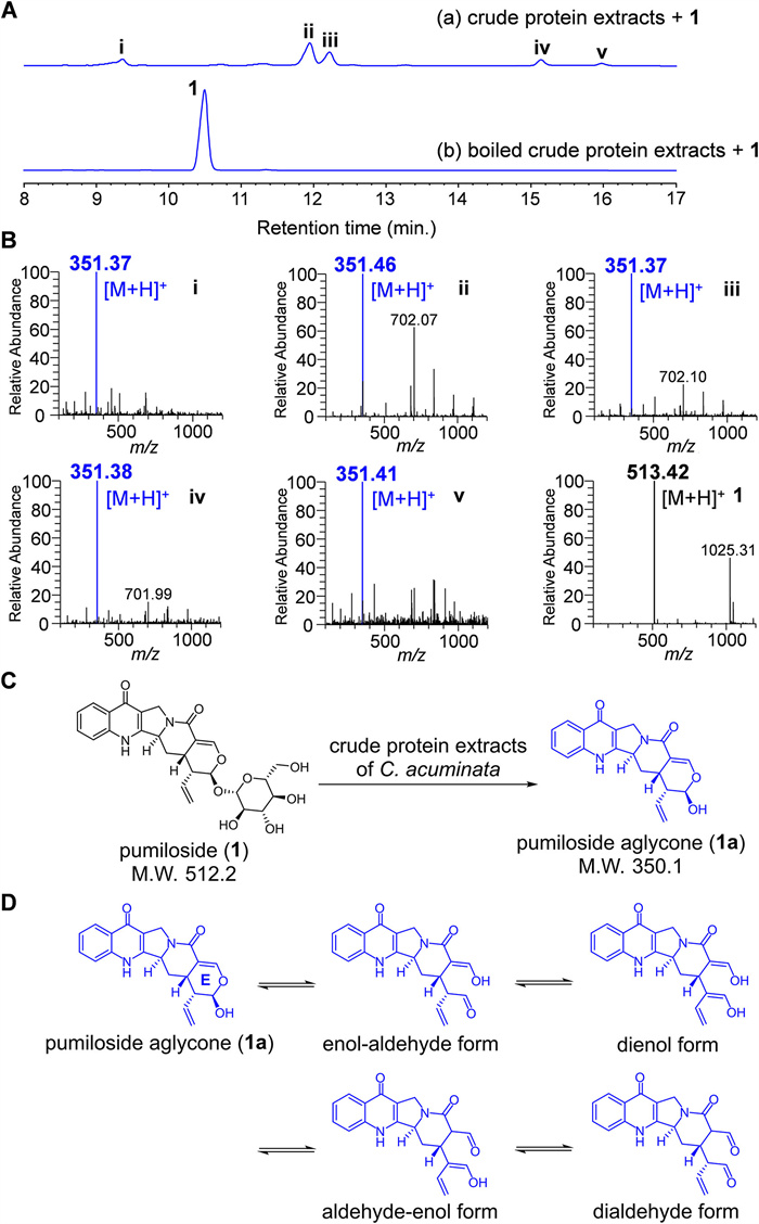 Figure 2.  Activity analysis of crude protein extracts from C. acuminata leaves. (A) HPLC chromatograms (240 nm) of C. acuminata crude protein extracts with 1 as a substrate. (a) Crude protein extracts + 1 incubated in sodium phosphate buffer (PB, pH 7.5); (b) boiled crude protein extracts + 1 incubated in PB (pH 7.5). (B) Typical positive MS spectra of products iv and substrate 1. (C) Conversion of 1 to 1a by crude protein extracts. (D) Possible chemical structures and the interconversion of five products of crude protein extracts with 1 as a substrate reacting in PB. UV spectra of the products iv and substrate 1 are shown in Fig. S1.