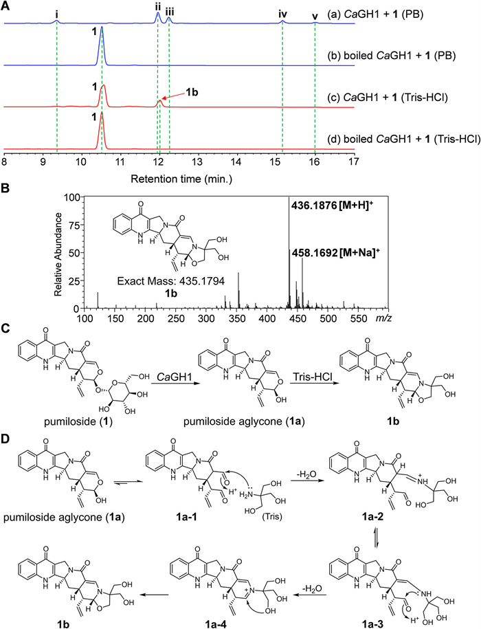 Figure 3.  Functional characterization of CaGH1. (A) HPLC chromatograms (240 nm) of purified recombinant CaGH1 with 1 as a substrate. (a) CaGH1 + 1 incubated in sodium phosphate buffer (pH 7.5, PB); (b) boiled CaGH1 + 1 incubated in PB (pH 7.5); (c) CaGH1 + 1 incubated in Tris–HCl buffer (pH 7.5); (d) boiled CaGH1 + 1 incubated in Tris–HCl buffer (pH 7.5). (B) (+)-High-resolution electrospray ionization mass spectrometry ((+)-HR-ESI-MS) spectrum of product 1b. (C) Enzymatic conversion from 1 to 1a by CaGH1 and spontaneous conversion from 1a to 1b in Tris–HCl buffer. (D) Proposed formation mechanism from pumiloside aglycone (1a) to 1b in Tris–HCl buffer.