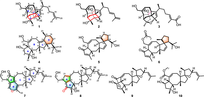 Our group has a longstanding interest in the ophiobolin-derived sesterterpenoids from the genus Bipolaris [27,2932]. In the course of our continuing search for structurally interesting and bioactive ophiobolin-derived sesterterpenoids, the phytopathogenic fungus, Bipolaris oryzae, was investigated. At present, there is not much research on the secondary metabolites of Bipolaris oryzae, mainly producing ophiobolins [3335]. In this paper, ten new ophiobolin-derived sesterterpenoids, bipolarpenoids A–J (110), were isolated from the ethyl acetate extract, which possess four new classes of skeletons. Among them, 1 and 2 represent the first examples of sesterterpenoids with a new 5/6/6/5/6 carbon-skeleton featuring a caged pentacyclo[8.4.0.01,5.04,9.07,11]tetradecane motif, and biosynthetically the core structure is constructed by the fusion of ring A on the western hemisphere and ring D on the eastern. In this article, we report the isolation, structural elucidation, proposed biosynthetic pathways, and bioactivity evaluation of these new compounds (Fig. 1).