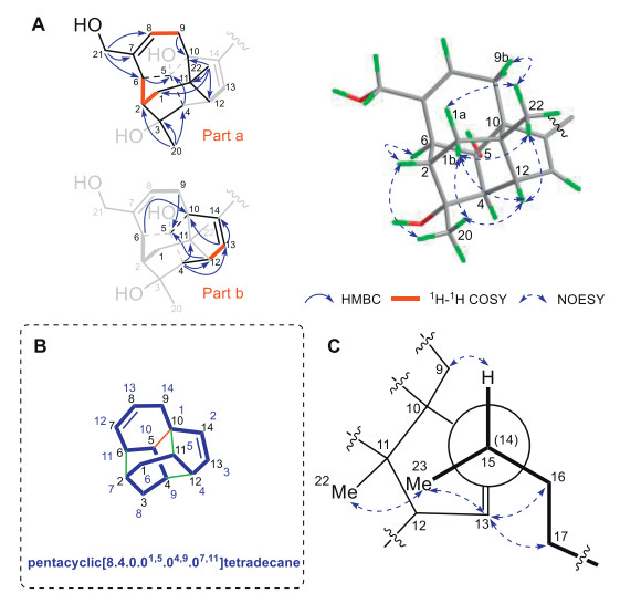 Figure 2  (A) Key 2D correlations of 1 and 2. (B) The nomenclature of the unusual bridged system (numbering blue) of 1 and 2. (C) Newman projection with a view along the C-14–C-15 bond of 1 and 2.