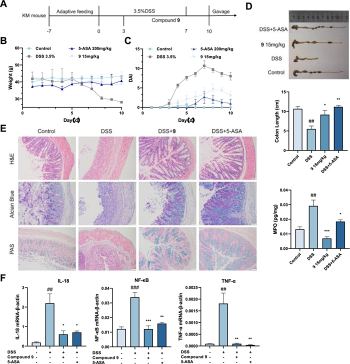 Figure 3  Effect of compound 9 on DSS-induced ulcerative colitis. (A) Experimental design. (B) Changes in body weight of mice. (C) Assessment of the activity index of colitis disease. (D) Colonic length of mice. (E) Colonic H&E, Alcian blue, and PAS staining and histopathological score. (F) Result of IL-18, NF-κB, and TNF-α mRNA expression in colonic tissues. Data were presented as the mean ± standard deviation (SD) (n = 3). ##P < 0.01, ###P < 0.001 vs. the control; *P < 0.05, **P < 0.01, ***P < 0.001 vs. the model. MPO, myeloperoxidase.