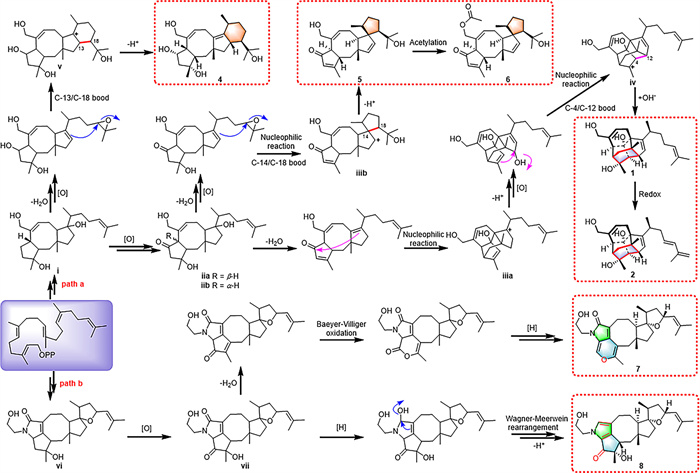 The unusual sesterterpenoids (1, 2, and 48) give rise to questions about their biosynthetic origin. The putative biosynthetic pathways were proposed, as shown in Scheme 1. Starting from GFPP, a series of via a series of enzymatic reactions and then undergoes two unusual pathways (paths a and b). In path a, undergoes multi-step oxidizations to afford intermediates ⅱa and ⅱb (6–epi isomers) [36]. Subsequently, ⅱa undergoes dehydration, and nucleophilic reactions to afford intermediate ⅲa bearing a 5/6/6/5 fused carbon skeleton [27]. Further deprotonation, oxidization at C-12, and nucleophilic reactions of ⅲa produce , which possesses a new single carbon−carbon bond between C-4 and C-12. Finally, a hydroxylation of iv generates 1, which further undergoes a redox reaction to afford 2. In addition, ⅱb undergoes dehydration, oxidization, and nucleophilic reactions to form intermediate ⅲb with a new 5/8/5/5 fused carbon skeleton. Then, an additional deprotonation reaction led to the formation of 5, which further undergoes an acetylation reaction to afford 6. On the other hand, directly undergoes dehydration, oxidization, and nucleophilic reactions to form intermediate with a new 5/8/5/6 fused carbon skeleton. Afterward, the same deprotonation reaction led to the formation of 4. In path b, an oxidization reaction of generates ; on one hand, undergoes dehydration, Baeyer-Villiger oxidation, and reduction reactions to produce 7; on the other hand, might undergo a series of reduction, Wagner-Meerwein rearrangement, and deprotonation reactions to form 8.