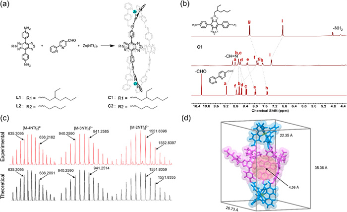 • Figure 1  (a) Subcomponent self-assembly of metallohelicates C1 and C2. (b) 1H NMR spectrum of C1 (CD3CN, 500 MHz, 298 K). (c) Experimental and theoretical ESI-MS spectra of metallohelicate C1. (d) Optimized structure of metallohelicate C1 obtained using Molecular Orbital PACkage (MOPAC) software.